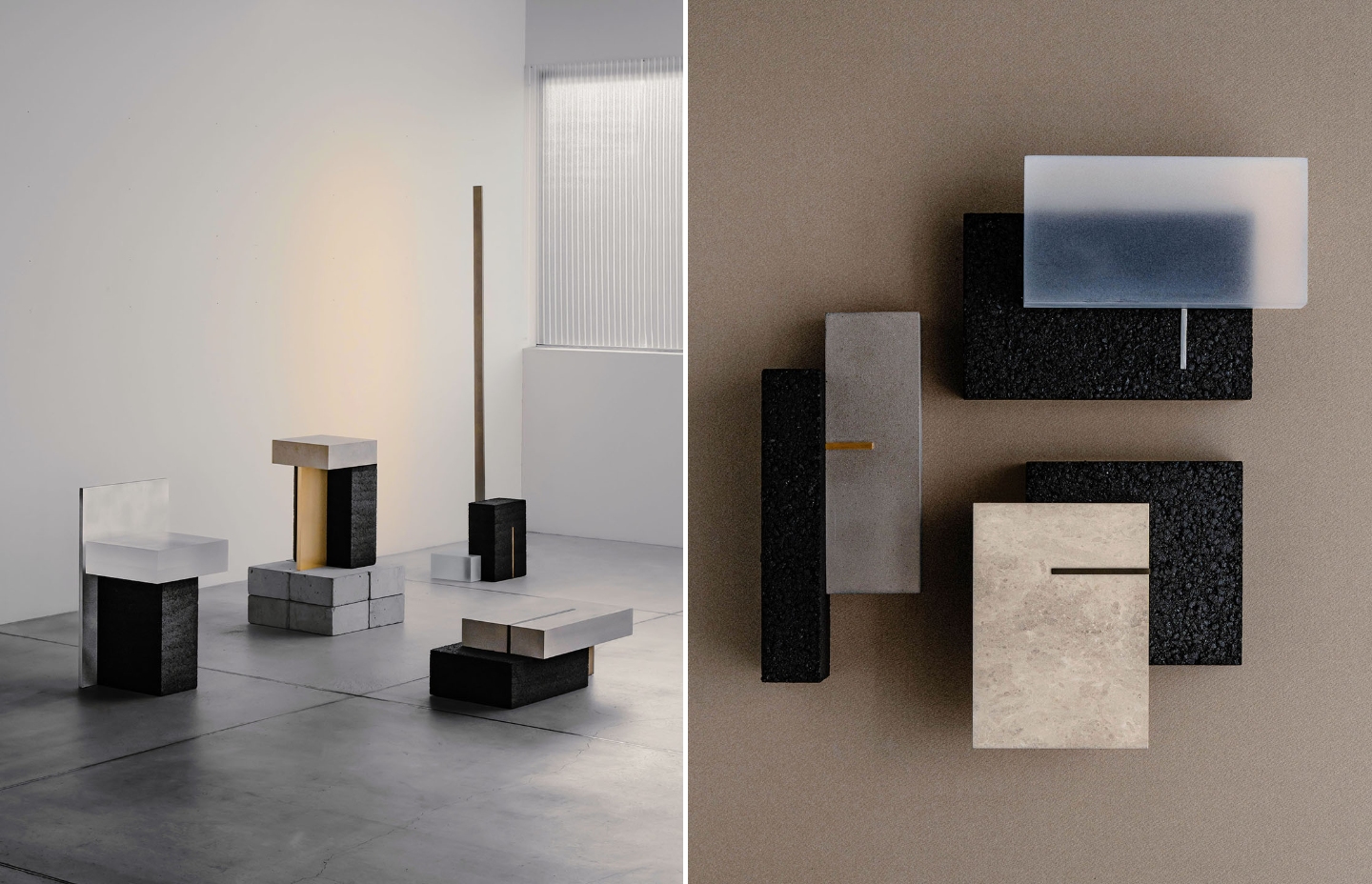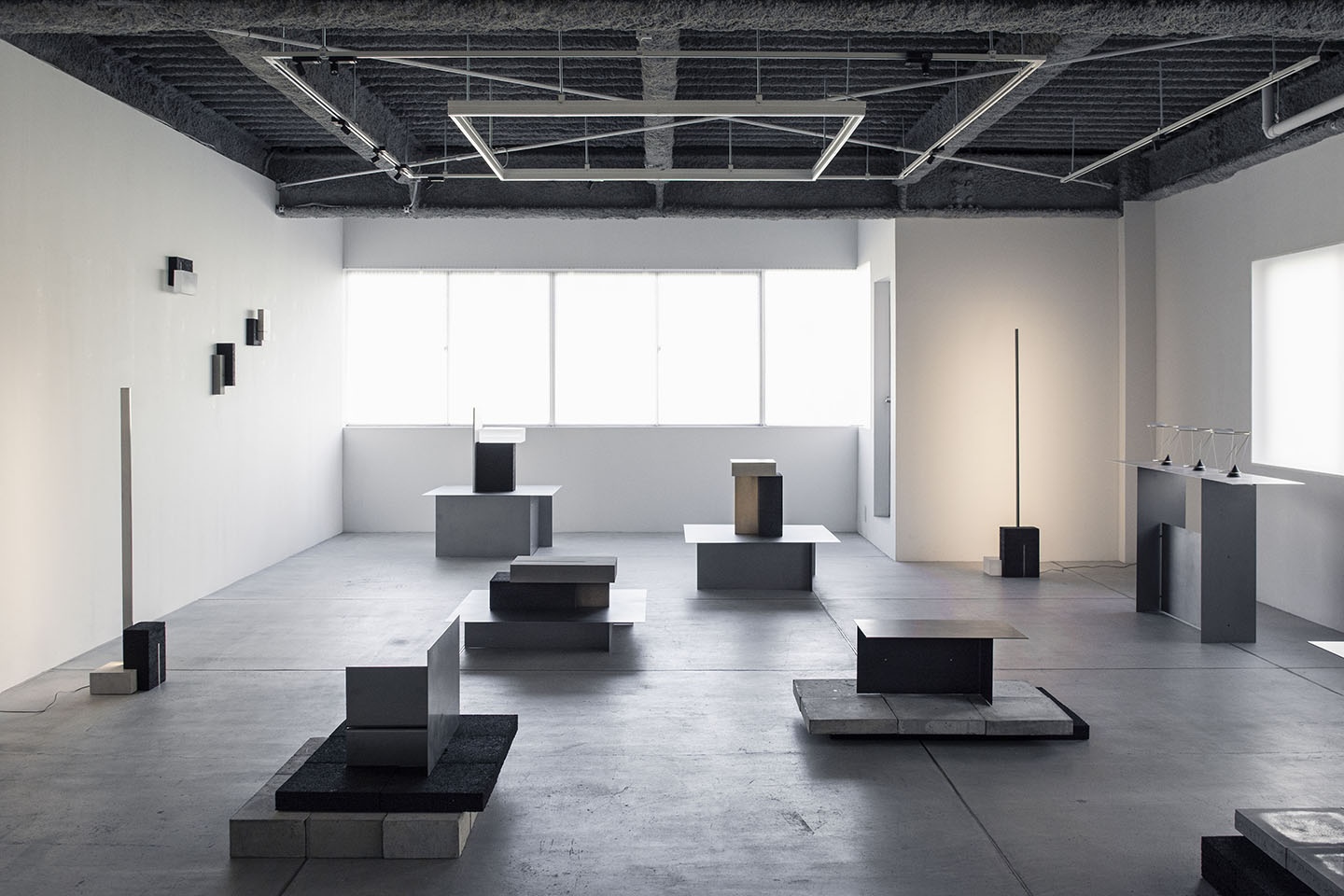 「As」(2025)。金属、石、樹脂などの異素材をアスファルトによって結合させ、スツールやサイドテーブル、照明などの家具コレクションの作品を制作。MATOYAの窓からの彩光によって、各々の素材の美しさが引き立つ。Photos by MATOYA