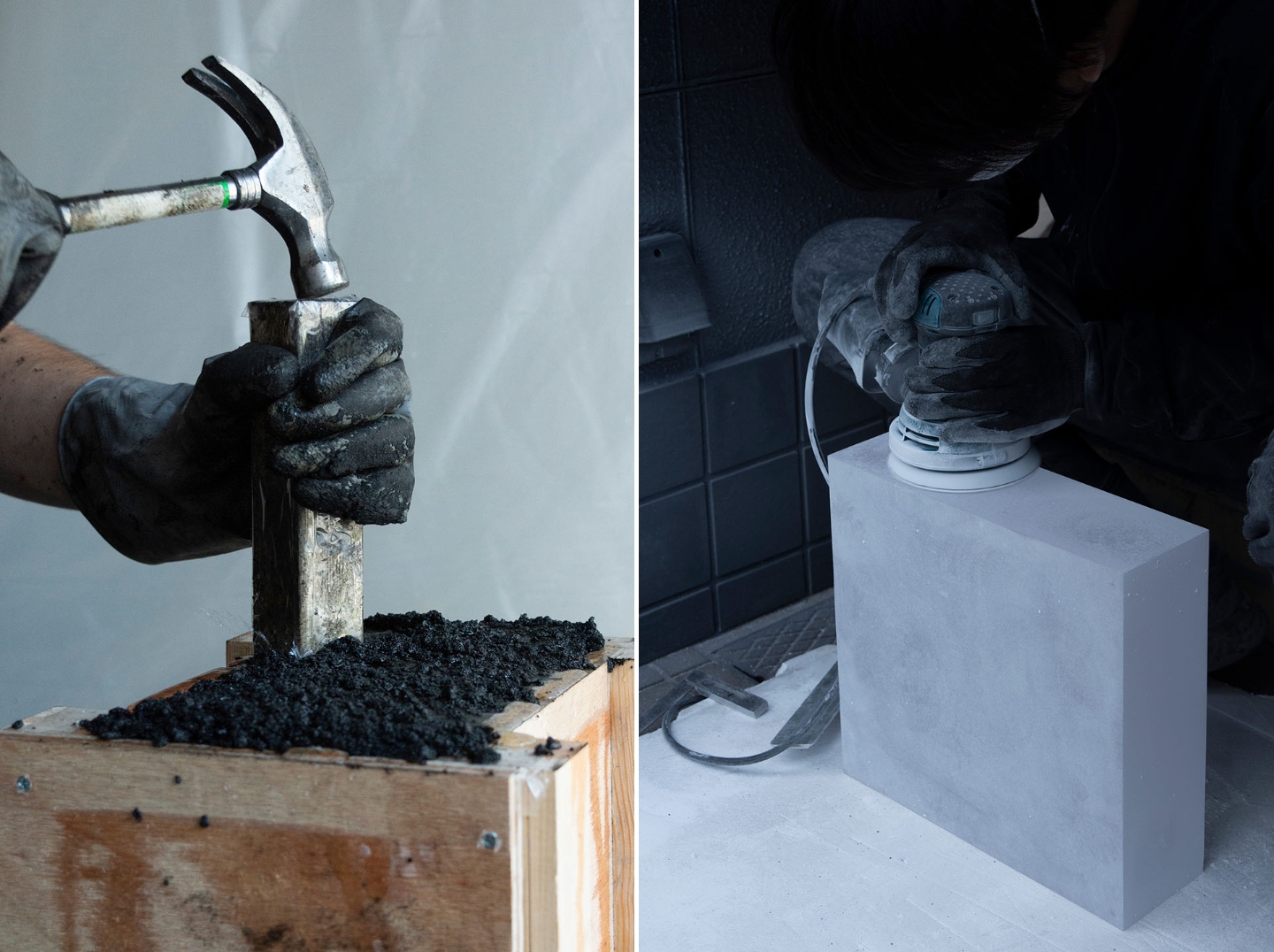 「Fossilized Future」(2024)。2024年のアルコヴァ・ミラノでの展示風景。事務所の近くでナラ枯れした伐採木とその周囲の土、コーヒーかすや野菜くずといった現代の暮らしから出たものを型枠に入れて固めて、化石を発掘するかのようにチェーンソーで切り出して完成させたスツール。Photos by Yuta Sawamura