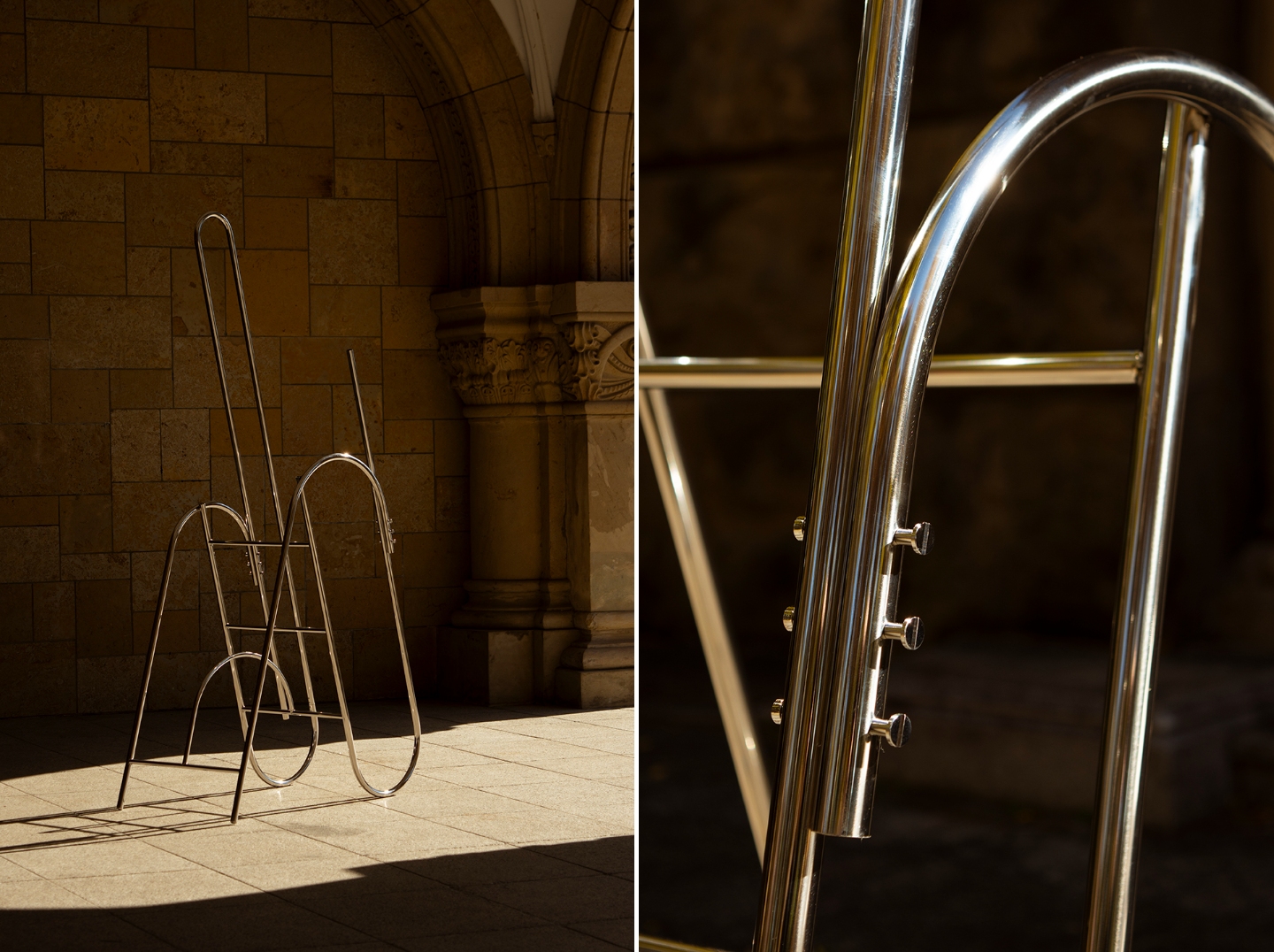 「Resonique」丹青社(2025)。写真では細身で華奢な印象を受けるかもしれないが、実際には大胆かつ力強い造形で、十分な強度と実用性を兼ね備えている。管楽器のバルブをモチーフに取り入れ、細部の表現にもこだわったという。製作:丹青社、菊川工業 Photos by SO KOIZUMI DESIGN