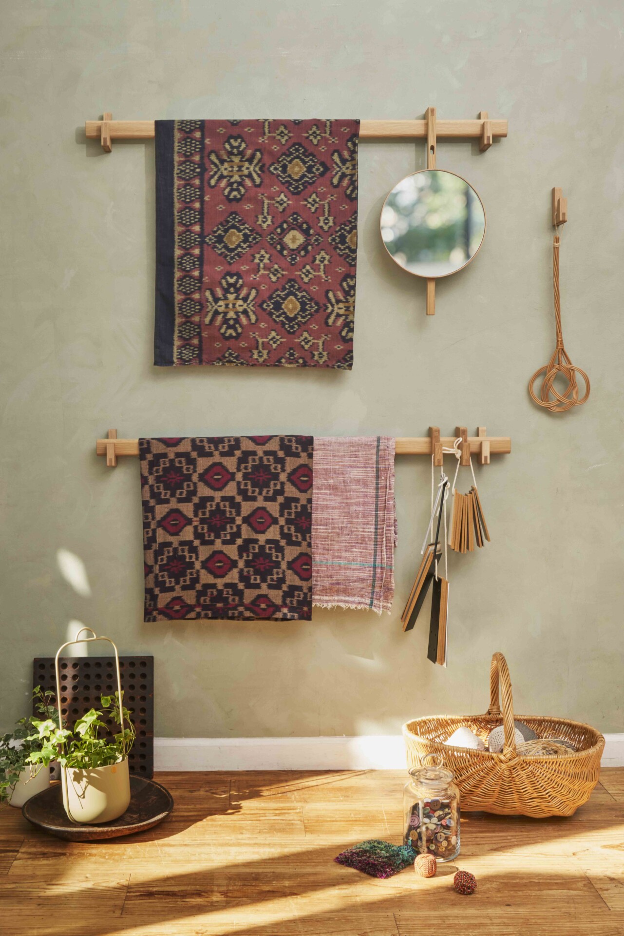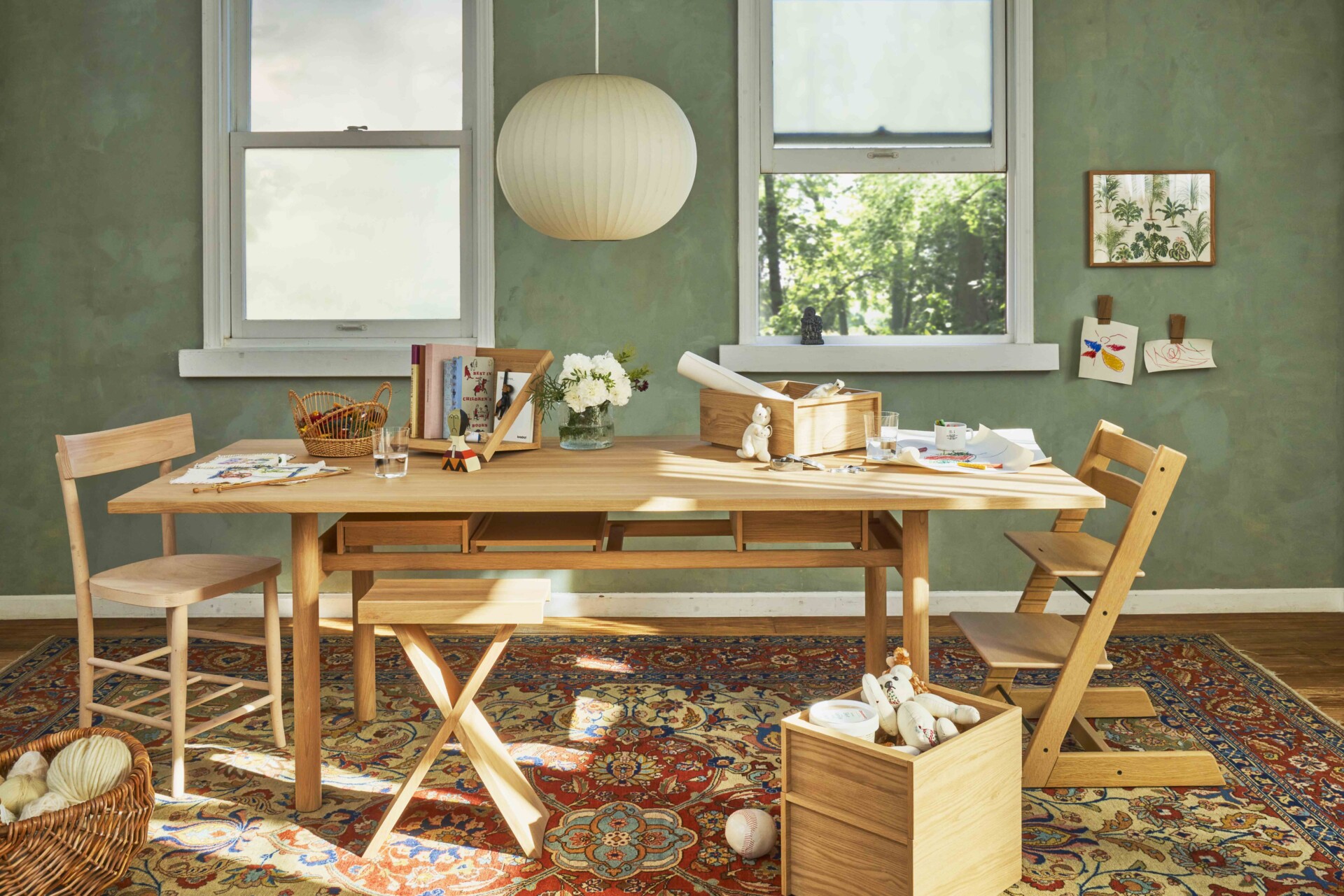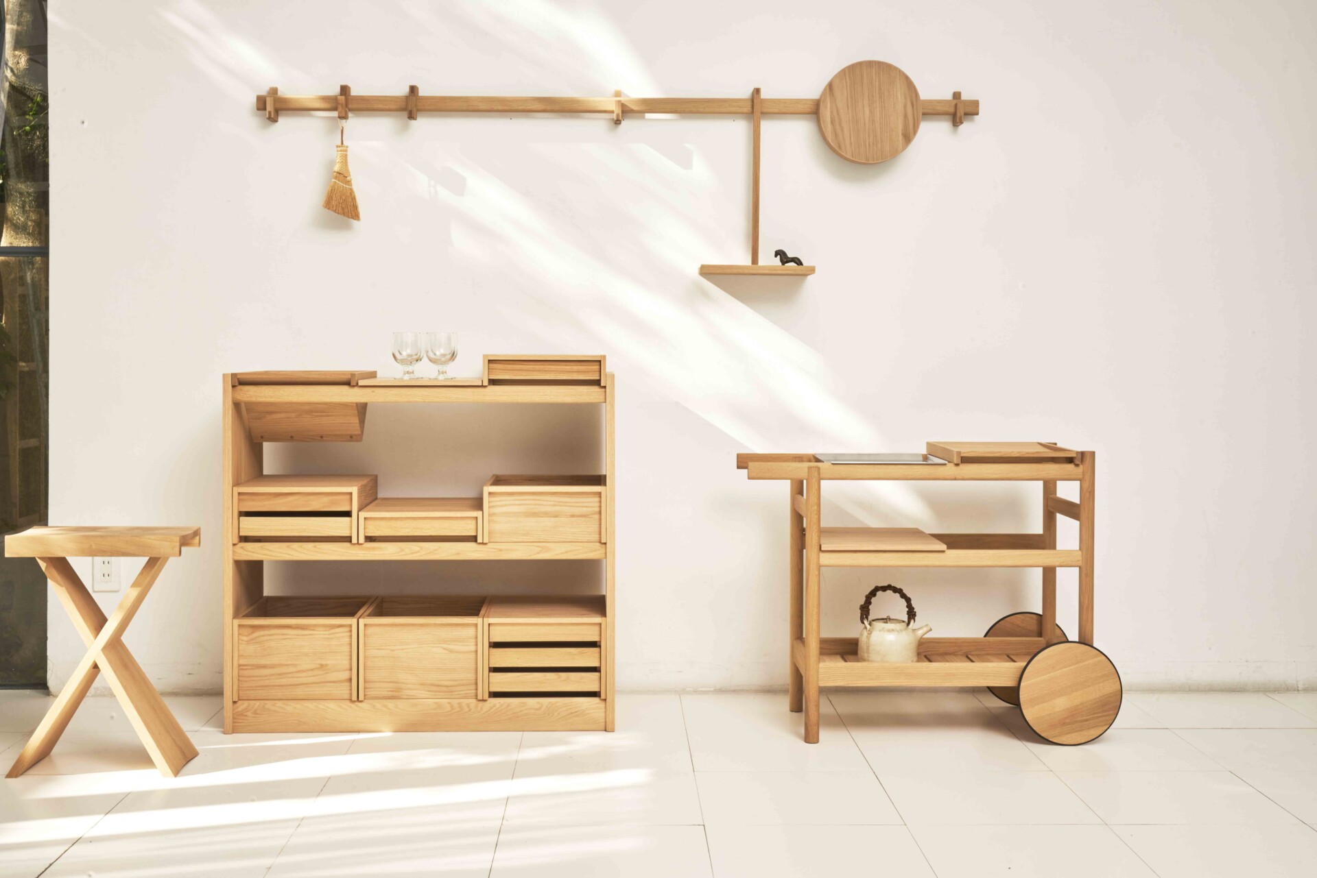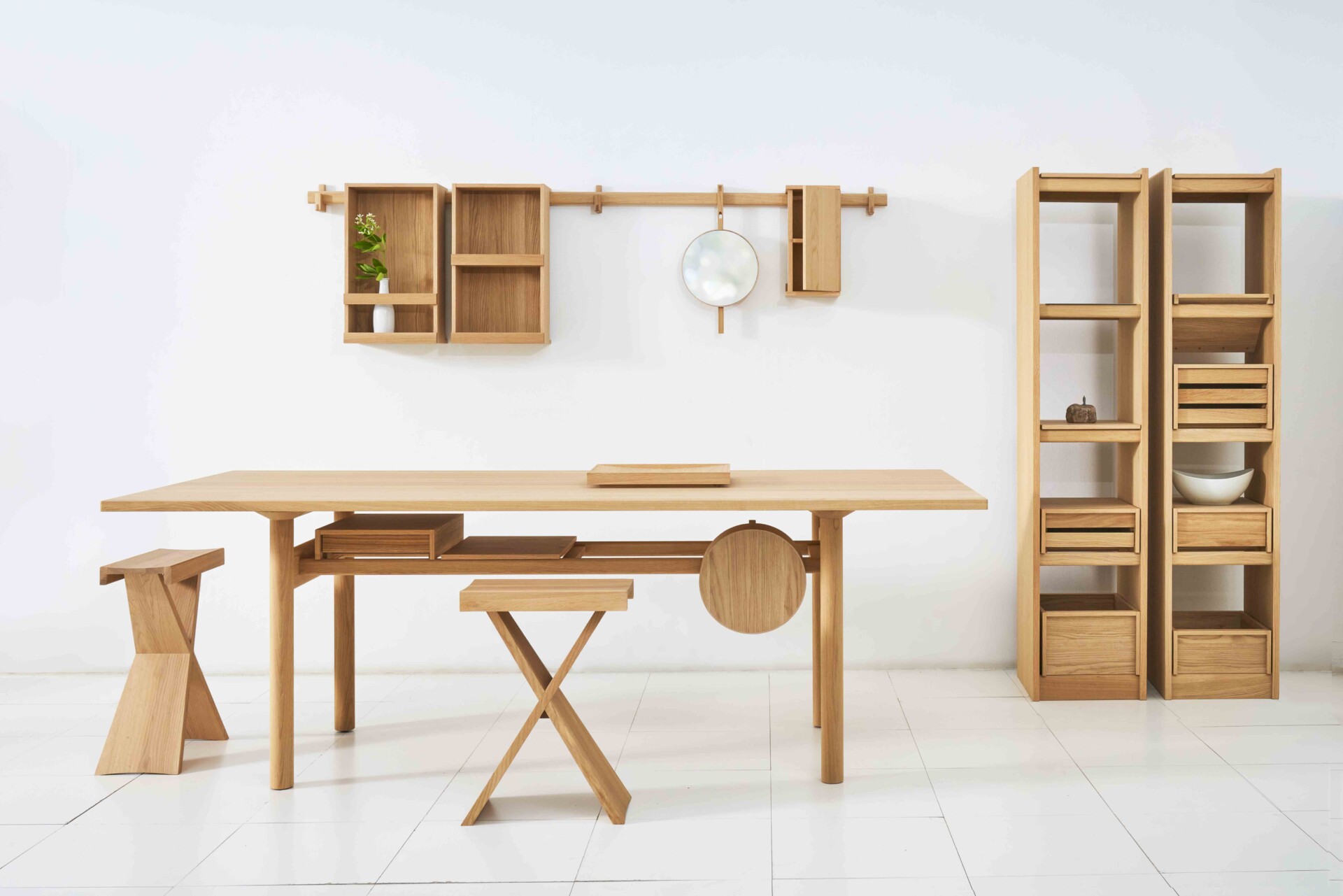 ラインアップは、フックやバーを起点とした壁面収納、ボックス、ドロワー、トレー、キャビネット、ダイニングテーブルなど全29アイテムで構成。30cm幅の最小モジュールを基準に設計され、A4サイズを収めるボックスや、間柱ピッチを踏まえたバー寸法など、日本の住環境を意識したスケールが採用されている。国産ナラ材を用い、木肌の表情を活かすピュアオークウレタン塗装で仕上げた。