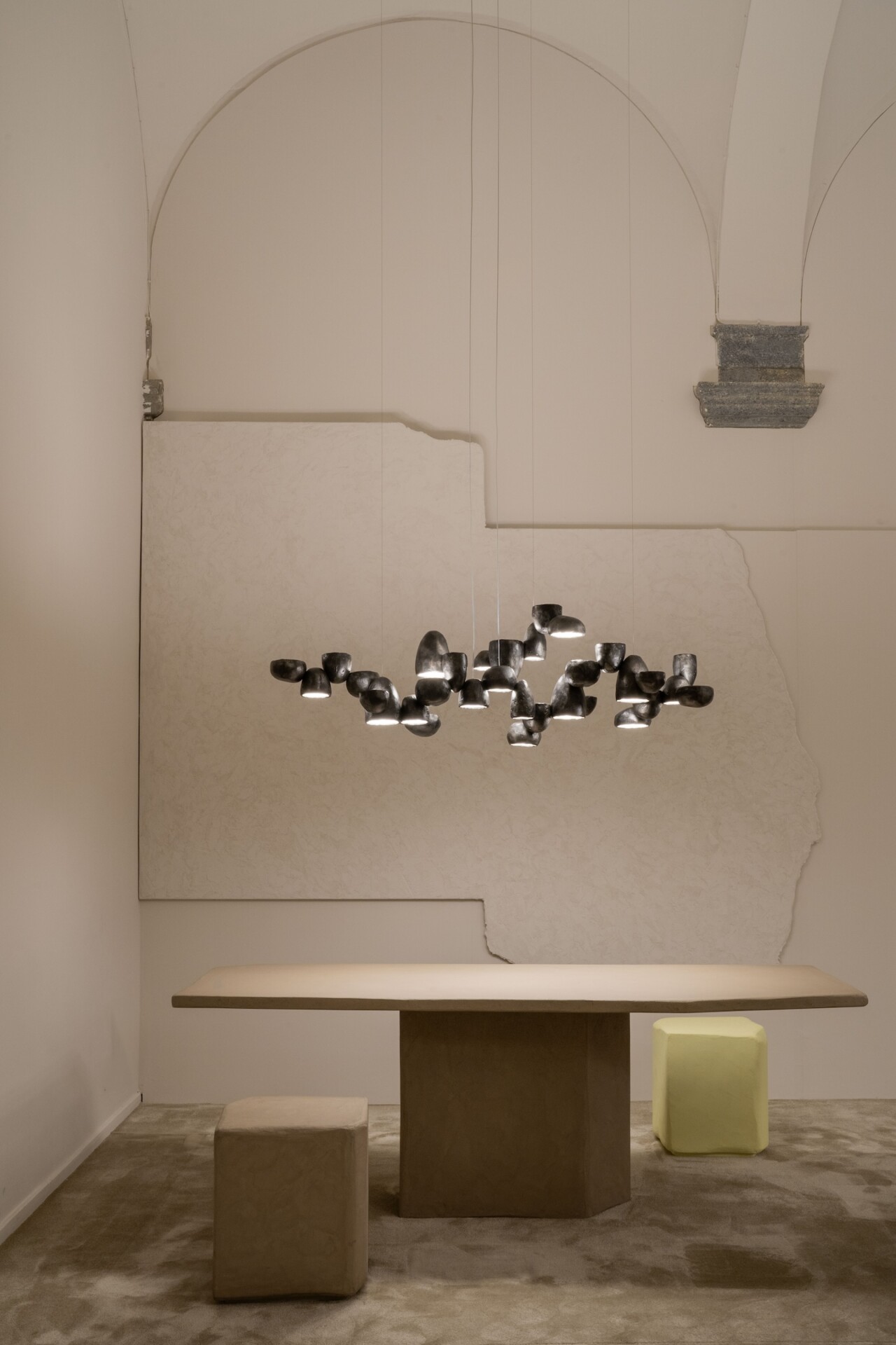 Giopato CoombesがデザインしたScarabeiは「自然な成長」という原理に基づき、同じ形の反復ではなく、わずかに変化しながら広がる照明器具シリーズ。土型で鋳造されたドーム状のアルミニウムが集まり、環境のなかで拡張・収縮するような集合体をつくる。遠くからは立体的な地形のように見え、近づくと土の質感をもつ細かな表情が現れる。光と影が曲面を浮かび上がらせ、知覚を変化させるような体験を創出する。©Giopato Coombes