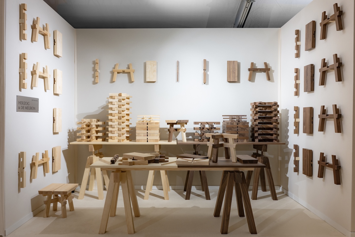 ヘルツォーク&ド・ムーロンが設計した香港の美術館M+の設計プロセスから生まれた「Hong Kong Stool」。アジアの伝統的な木製門や木工技術に着想を得た構造で、一本の木ネジで全体を固定するパズルのような構造が特徴。竹の質感を思わせる加工が施され、アナログとデジタルの境界を探るデザインでもある。今回、ウォルナットとアッシュ材を組み合わせた限定シリーズ「Droite et Gauche」を展示・販売した。©MickaëlLlorca