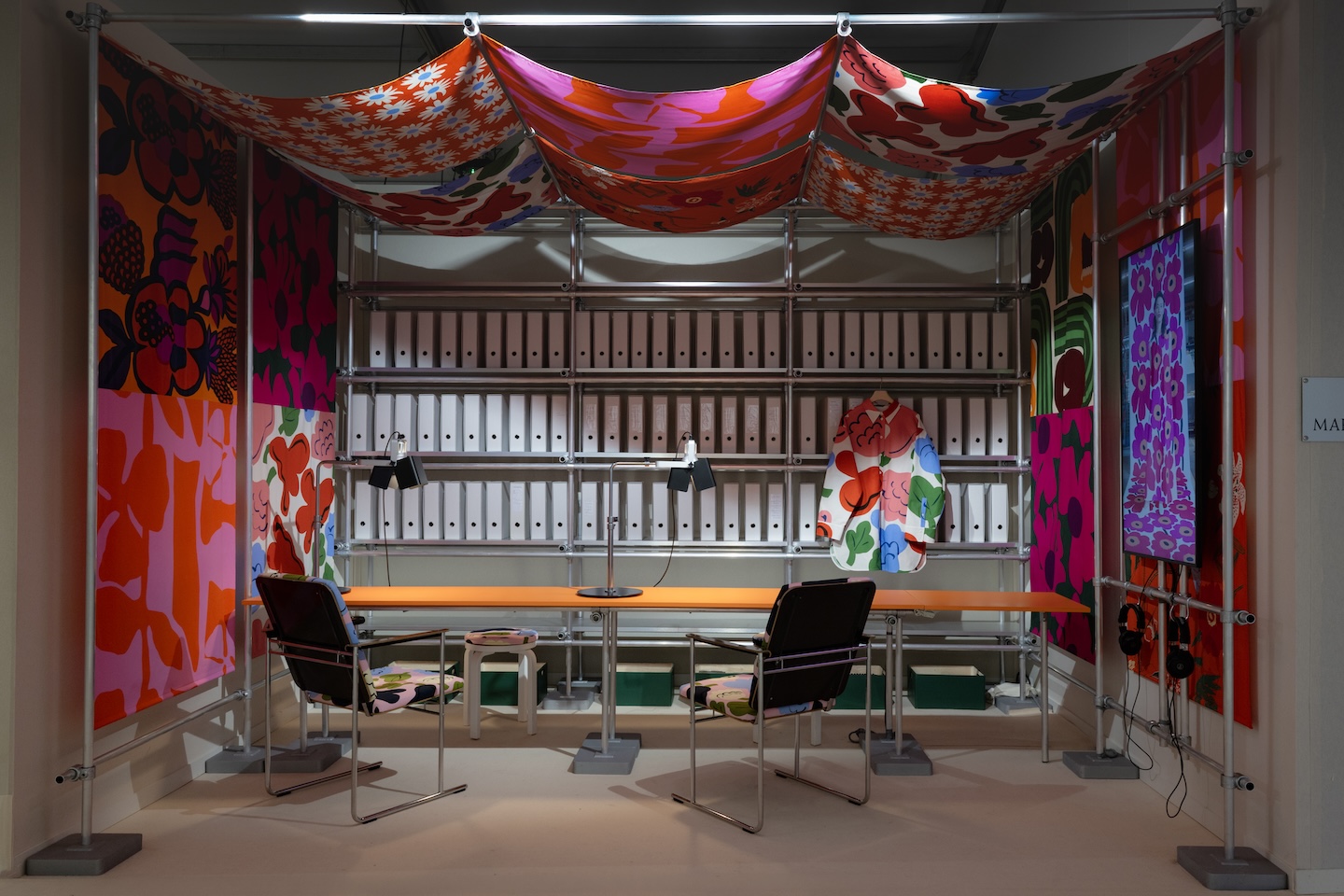 創業から現在にいたるまでのテキスタイルに使用されるパターンやモチーフのアーカイブを紹介したマリメッコ。