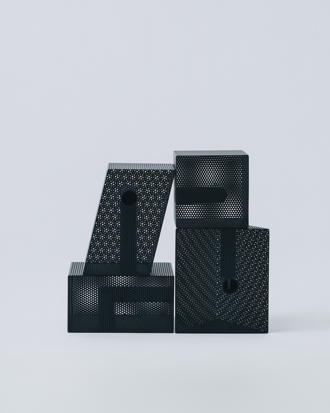 各作品はパンチングメタルを箱状に構成し、内部にL字型の金属パイプを貫通させたシンプルな構造を持つ。外観は一つの塊として立ち上がる一方で、内部構造は完全には隠されず、光や視線の角度に応じて断片的に現れる。構造と視覚のあいだに生じるズレが、オブジェとしての意味を固定することなく、その都度関係性を更新していく。